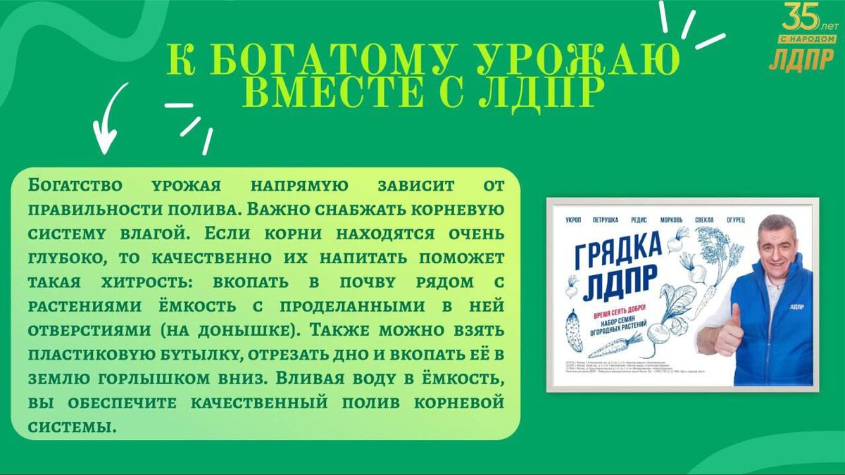 Правильный полив – залог хорошего урожая Тюменское региональное отделение ЛДПР продолжает рубрику «К богатому урожаю вместе с ЛДПР», в рамках которой вы можете узнать интересные советы и рекомендации для роскошных грядок. Не упустите возможность узнать секреты богатого урожая от ЛДПР! Следите за нашими публикациями и готовьтесь к новому дачному сезону вместе с нами! Напоминаем, что если вы хотите получить качественные семена «Грядка ЛДПР», то вы можете обратиться в местное отделение ЛДПР вашего муниципалитета, в Тюменское региональное отделение ЛДПР или заполнить заявку онлайн по ссылке: vk.com/app53455430
