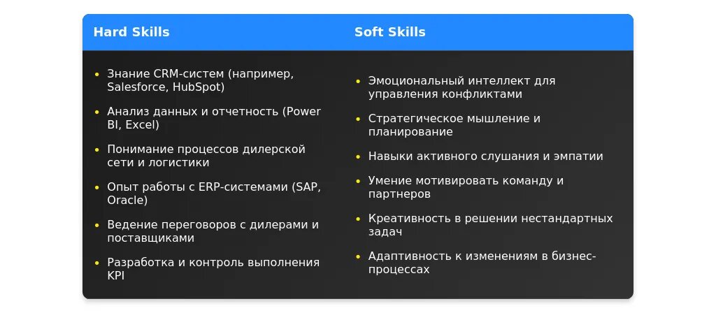 Обязательно включить: профессиональные навыки, ключевые достижения, личные качества, которые важны для работы в дилерском отделе.