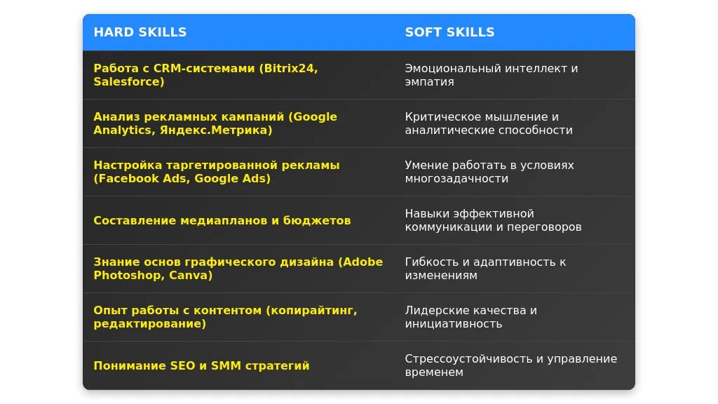 - Укажите продвинутые навыки (например, настройка сложных рекламных кампаний).