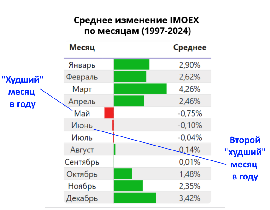 Начался первый летний месяц июнь и я решил выяснить, как наш рынок акций исторически вёл себя в этот период в прошлом, а так же спрогнозировать, что будет с рынком в июне 2025 года! Для начала давайте посмотрим, что говорит фактор сезонной статистике: Стоит отметить, что прошедший месяц май полностью подтвердил своё звание "худшего месяца в году" и в пике наш рынок показывал снижение почти на -8%, но в конце месяца индекс Мосбирже перешёл к восстановлению и сумел удержаться выше важного уровня в 2800п.