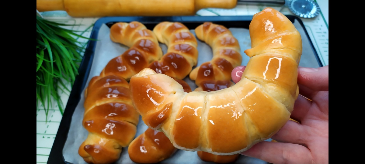 Перед выпечкой я рогалики ничем не смазывала, зато сразу после извлечения из духовки, в горячем виде, смазываю их растопленным сливочным маслом.
