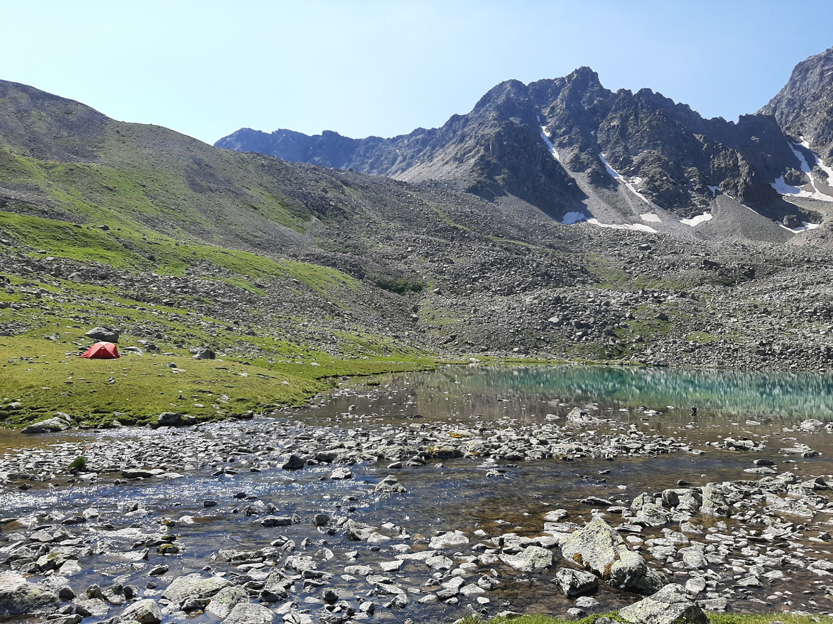 Первое озеро, точнее два озера, лежащих рядом друг с другом, порадовали глубоким синим стальным цветом. Лежащие в окружении суровых неприступных скал, они несмотря на свои небольшие размеры были весьма красивы. Берега озёр были покрыты крупными валунами и лишь в месте, где выходил ручей, и куда нас и привела тропа, они были более или менее удобны для стоянки.