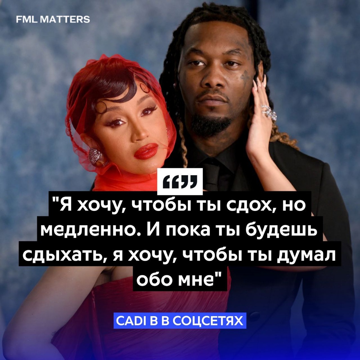В ответ на пост ❌ CARDI B ЖЕЛАЕТ OFFSET СМЕРТИ! Карди отказалась от алиментов ради быстрого развода с Оффсета, но после его требований алиментов, жёстко прошлась по нему в социальных сетях. 💀 FML MATTERS