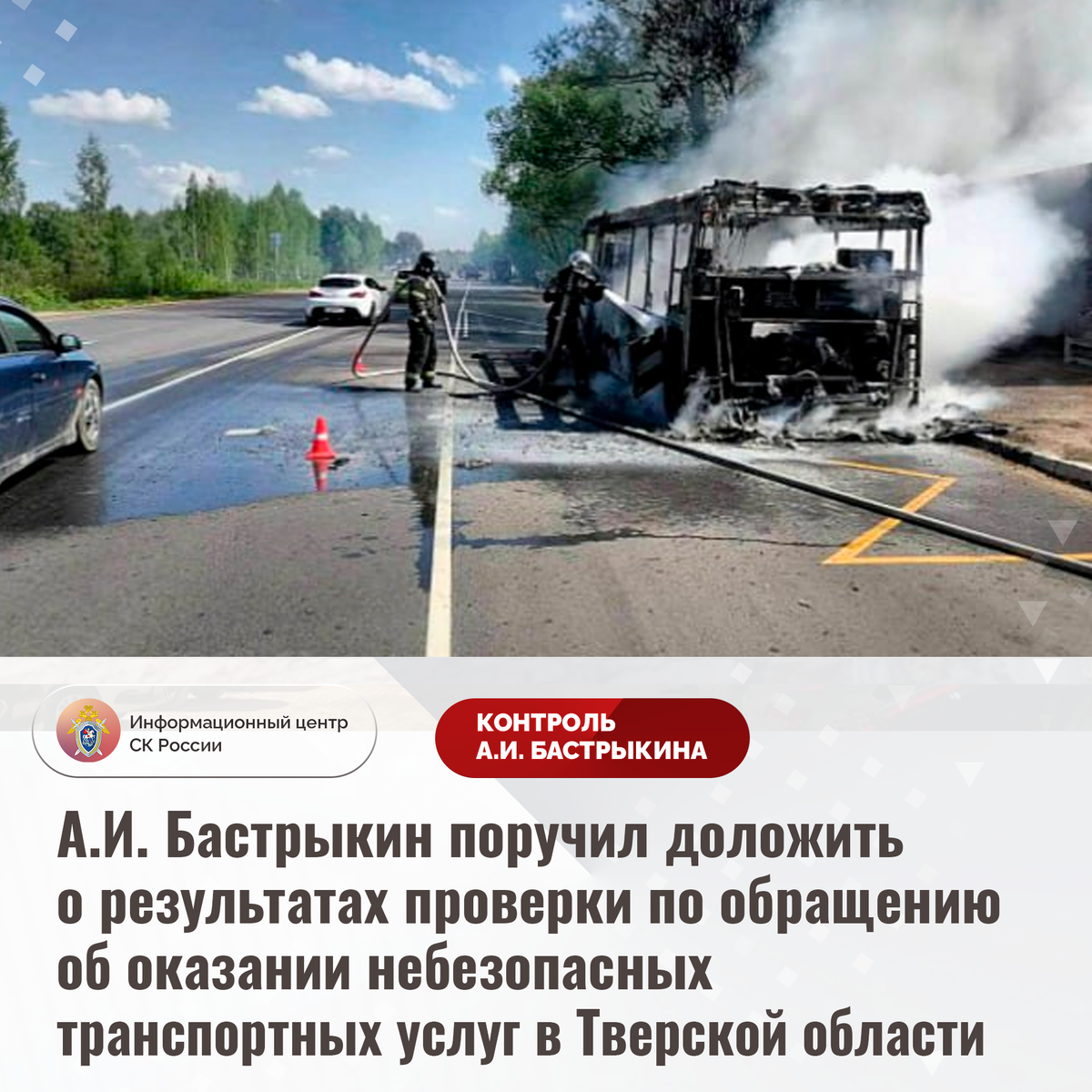 А.И. Бастрыкин поручил доложить о результатах проверки по обращению об оказании небезопасных транспортных услуг в Тверской области В комментариях в аккаунте приемной Председателя СК России А.И. Бастрыкина «ВКонтакте» размещено обращение об оказании небезопасных услуг одной из транспортных компаний в Тверской области. В мае текущего года в деревне Змеево в принадлежавшем фирме автобусе произошел пожар, повлекший уничтожение транспортного средства. В том же месяце в городе Твери произошло возгорание другого автобуса указанной организации. В обоих случаях пассажирам удалось избежать получения телесных повреждений благодаря своевременной эвакуации. Указанная ситуация освещалась в СМИ и социальной сети. В СУ СК России по Тверской области по доводам комментария начата процессуальная проверка. Председатель Следственного комитета Российской Федерации Александр Иванович Бастрыкин поручил руководителю СУ СК России по Тверской области Альберту Андреевичу Кизимову доложить о предварительных и окон