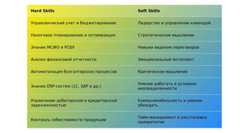 Навыки следует перегруппировать, чтобы выделить ключевые компетенции, указанные в вакансии. Например, если в вакансии упоминается "знание МСФО", этот навык должен быть на первом месте.