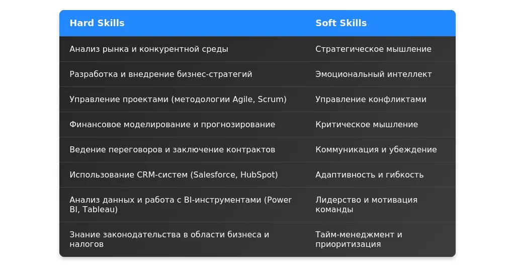 - Акцент на продвинутые навыки: стратегическое планирование, управление крупными проектами, анализ больших данных.