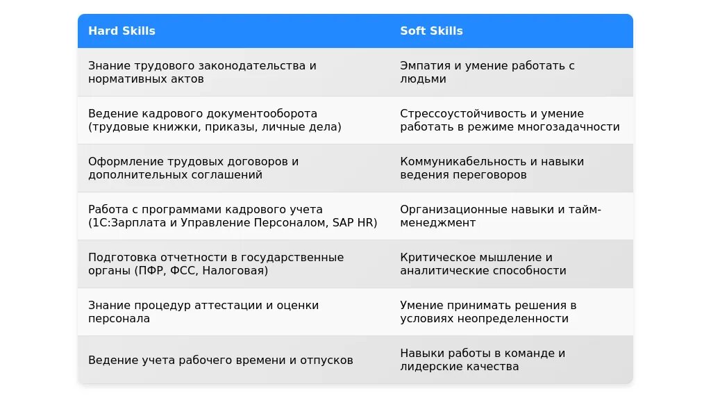 - Делайте акцент на базовых навыках: знание трудового законодательства, работа с документами.