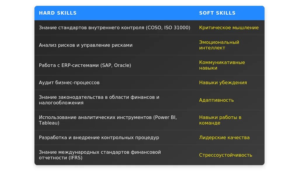 - Акцент на навыки, которые можно подтвердить обучением или стажировкой (например, знание стандартов COSO).