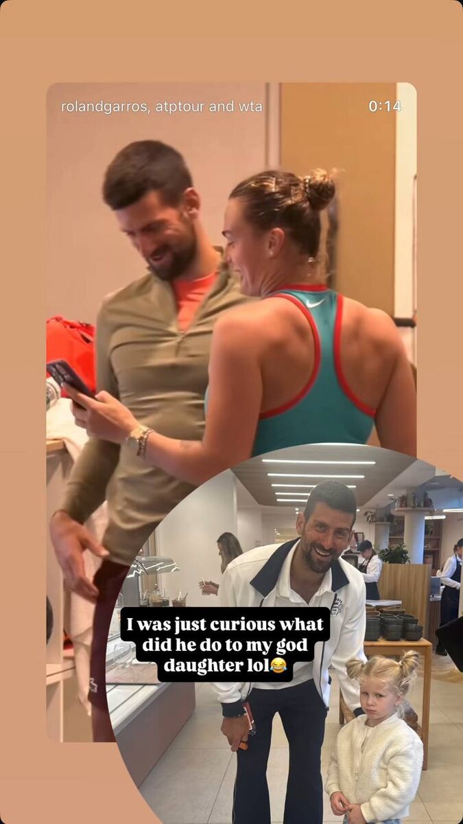 Накануне пресс-служба «Ролан Гаррос» опубликовала видео, на котором первая ракетка мира Арина Соболенко что-то показывает на своём телефоне 24-кратному чемпиону турниров Большого шлема Новаку Джоковичу, что вызывает у того улыбку.