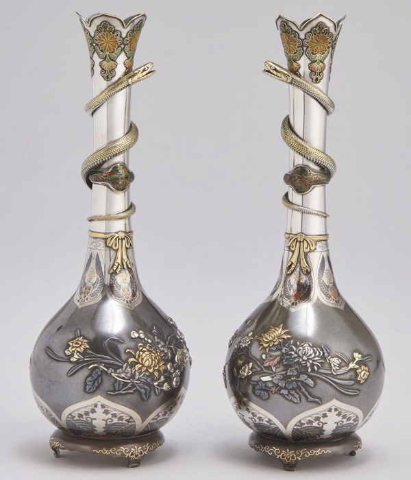 Пара ваз из серебра с инкрустацией цветными металлами и сплавами, высота 23,5 см, мастер Ямада Мотонобу, вероятно, для фирмы «Ozeki», конец XIX века.