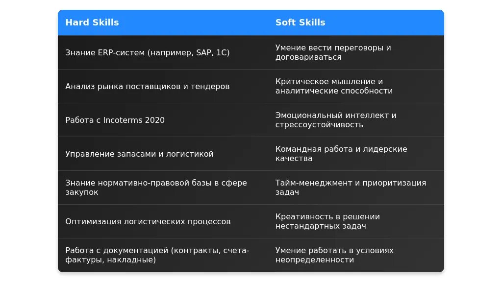 - Перечень актуальных и востребованных навыков в закупках и логистике, от владения специализированным ПО до умения вести сложные переговоры.