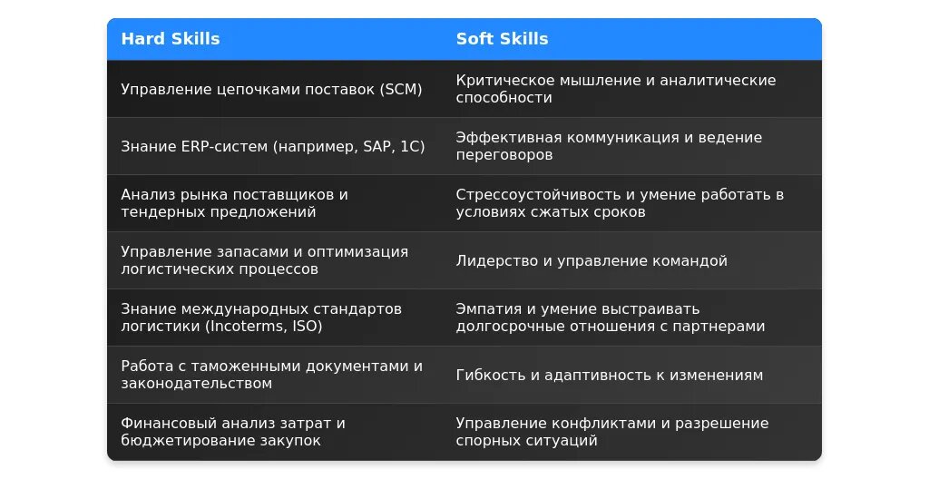 После адаптации: "Знание ERP-систем (SAP, 1С), опыт работы с международными поставщиками, навыки ведения переговоров."