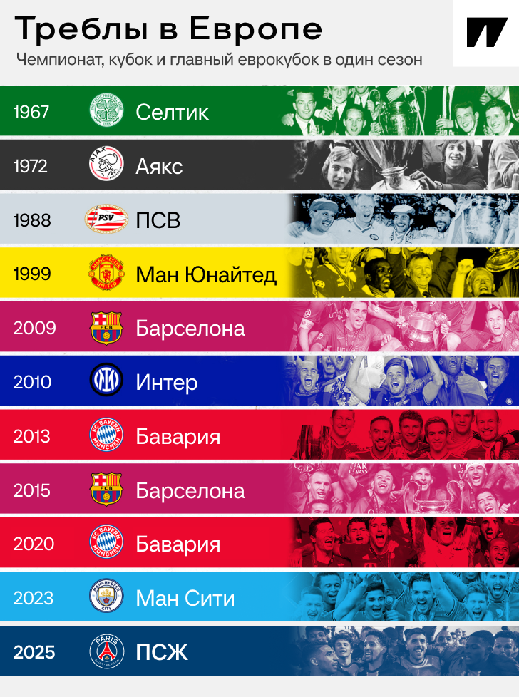Только он и Пеп. «ПСЖ» – победитель Лиги чемпионов! Добавили главный еврокубок к чемпионству в Лиге 1 и победе в Кубке Франции. То есть оформили требл: первый для себя и уже 11-й среди европейских команд. Элитная компания. Путь «ПСЖ» в элитный клуб: получилось только с третьего раза «ПСЖ» только в эпоху шейхов пять раз до этого сезона собирал главные домашние трофеи: и чемпионство, и кубок. Но вот с последней деталью долго не получалось – за Лигу чемпионов не было даже реальной борьбы. Первый подход к треблу случился в 2020-м – в ковидный год «ПСЖ» взял домашние трофеи, но проиграл финал ЛЧ «Баварии». Тогда как раз мюнхенцы сделали требл сами. В прошлом сезоне «Пари Сен-Жермен» снова выиграл Лигу 1 и Кубок Франции, а в Лиге чемпионов дошел до полуфинала. Там напоролся на дортмундскую «Боруссию» и получил два раза по 0:1 – надежды на требл умерли 7 мая. И вот третья попытка за пять лет – первая без Килиана Мбаппе, наконец-то успешная. Символично, что в Мюнхене – на стадионе клуба, котор