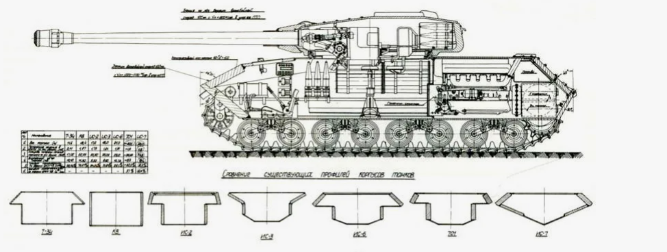 Данный танк является одним из прототипов ИС-7 и предпоследней ступенькой к нему. В начале 1945 года было разработано ТТЗ на танк. Он должен был выдерживать попадания из 128мм пушки (орудие Мауса и Ягдтигра), иметь скорость до 60 км/ч и вооружение в виде 122/152мм орудия. Дабы вписаться во все условия, пришлось хитрить с конструкцией корпуса и башни, так и появились борта с обратным скосом.