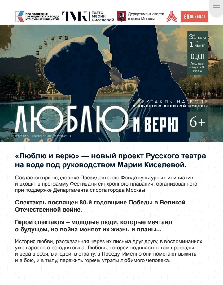 Я, как май начала концертом в Кремле в честь 80-летия победы, так и закончила тоже зрелищным мероприятием на эту же тему. Сегодня мы с дочкой сходили в Олимпийской центр синхронного плавания на Автозаводской, впервые побывали. Да я и не знала, что такой есть. И вообще не узнала бы этот район, столько всего понастроили. Мы были в корпусе 4- это Русский театр на воде под руководством Марии Киселевой. Вот такая программка, сложенная письмом-треугольником, ожидала на стуле каждого зрителя. Зрелище для меня было необычное- и сцена с артистами, и синхронисты в воде, и акробаты над водой. По анонсу не очень укладывалась в голове, как все это может совместиться с темой войны, потерь и разлуки. Но надо отдать должное авторам и создателям спектакля, они подошли к теме очень бережно и уважительно, нашли столько интересных сценических решений и нюансов, что они просто молодцы! В основу спектакля положен рассказ сына о судьбе его родителей, которых навек разлучила война ( закадровый голос Конста