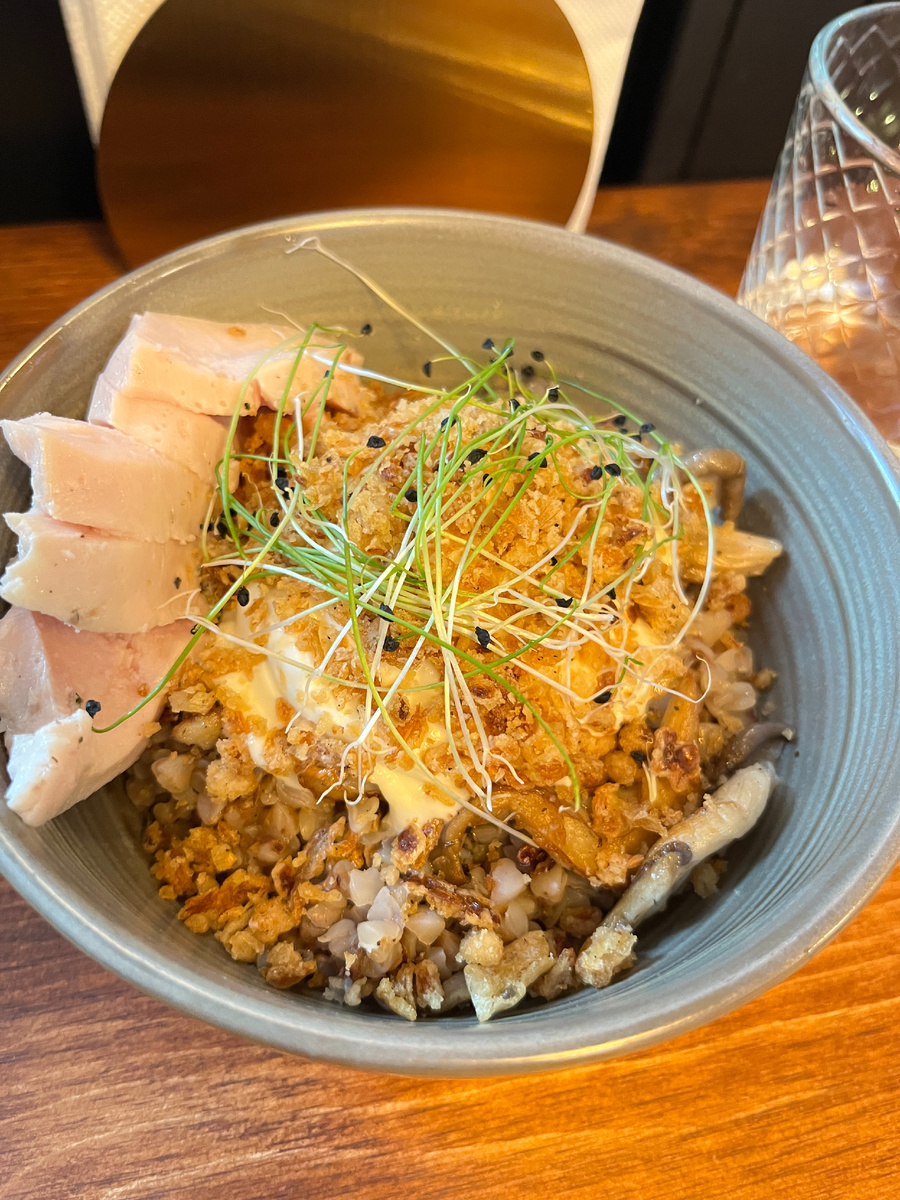 Место: Механика кофе (на Войстроченко) Не сразу обратил внимание на эту позицию, наверное ввиду излишней простоты, но зря. Оформлено аппетитно. По ощущениям как гречка с грибным жульеном. Сверху мой любимый пашот, криспи лук, добавляющий хруста и микро зелень. Курицу су-вид заказал допом, для полноты картины. Здесь нет сложных перебивающих вкусов, но за счет вешенок и пашота получилось интересно. Позиция когда хочется просто нормально покушать, но не хочется экспериментировать. Разнообразить можно другими добавками из меню. Гречка и овсянка в Механике кофе прям попали. Простые ингредиенты, но интересные подачи. С пастами пока мне так не зашло, суховаты.