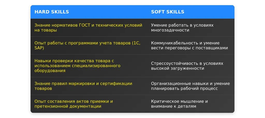 После адаптации: "Навыки работы в команде, соблюдение сроков приемки товара, взаимодействие с поставщиками."