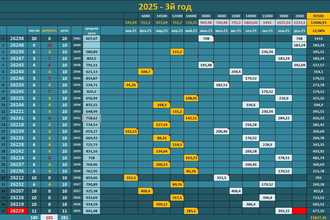 Облигационный портфель На 31.05.25 в портфеле 138764,73 руб (-2796,48 руб, -1,98%) 14.05.25 получены купоны по ОФЗ 26229 - 285,20 руб 21.05.25 получены купоны по ОФЗ 26225 - 108,45 руб получены купоны по ОФЗ 26236 - 85,26 руб 28.05.25 получены купоны по ОФЗ 26224 - 103,23 руб получены купоны по ОФЗ 26241 - 142,11 руб ИТОГО: 724,25 руб По плану куплены: 3 шт ОФЗ 26229 по цене 949,99. Средняя цена стала 941,48 руб. 3 шт ОФЗ 26236 по цене 773,30. Средняя цена стала 762,95 руб. 3 шт ОФЗ 26225 по цене 614,88. Средняя цена стала 656,94 руб. 3 шт ОФЗ 26247 по цене 803,50. Средняя цена стала 803,5 руб. 3 шт ОФЗ 26241 по цене 747,30. Средняя цена стала 758,62 руб. 3 шт ОФЗ 26224 по цене 755,99. Средняя цена стала 758,00 руб. В июне планируется покупка 3шт ОФЗ 26243 и 3шт ОФЗ 26248 и получение купонов на сумму 903,48 руб. Портфель акций 19 мая были получены дивиденды за 1 лот Новатэка - 40,65 руб По плану были куплены акции: 13 мая Сургутнефтегаза 50шт по цене 527,20 руб. Средняя цена в портфе