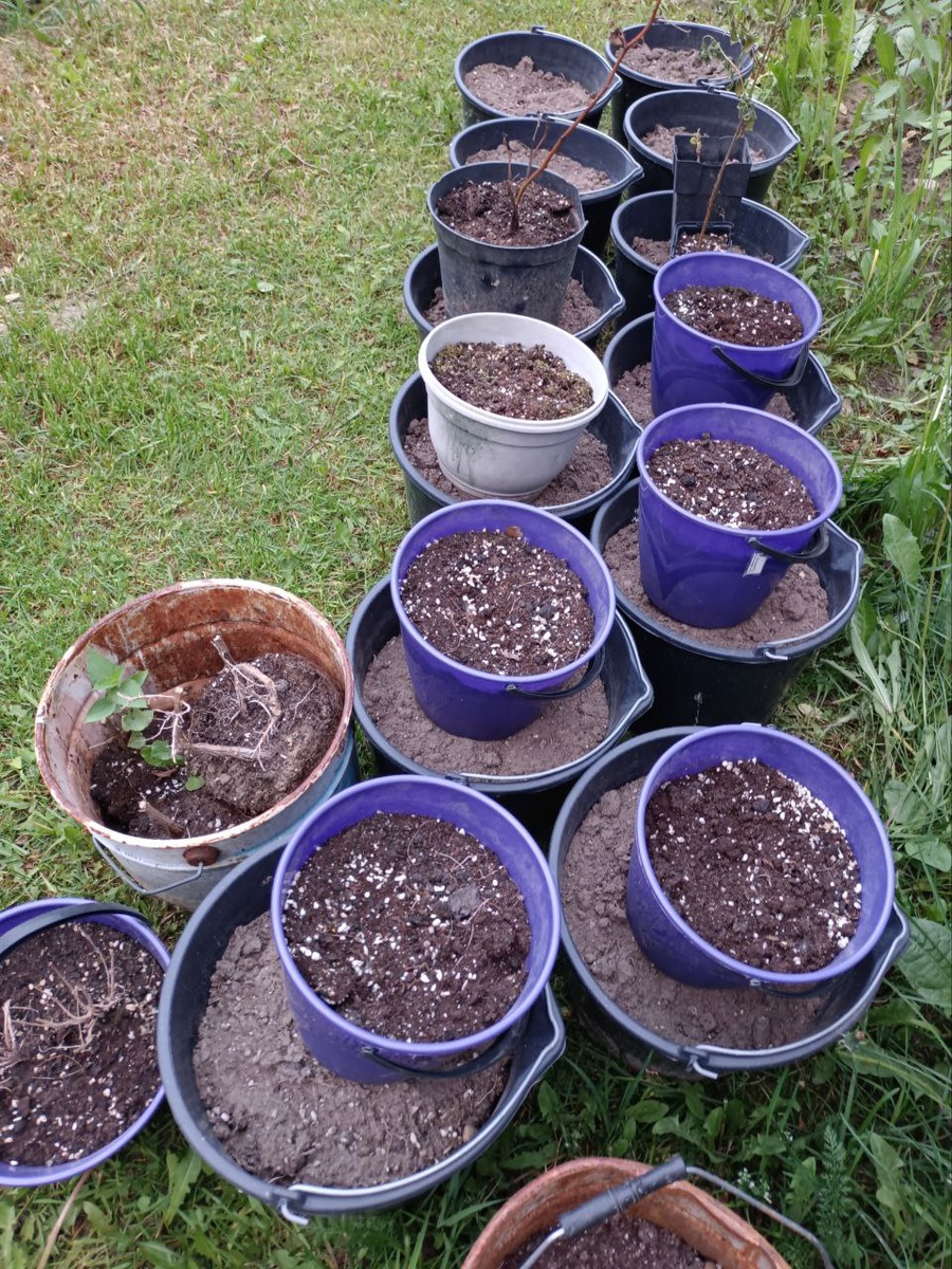 12 литровые вёдра, с дюжину, и мелочь разная — все очищены от сорняков. Суда сажать можно всяко разного. Земля очень хорошая. Но не сегодня, сажать.