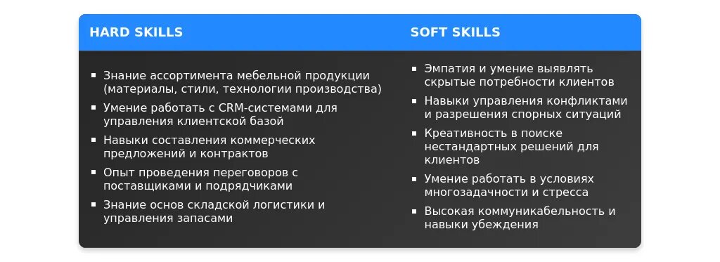 "Навыки ведения переговоров, работа с возражениями, знание CRM-систем."