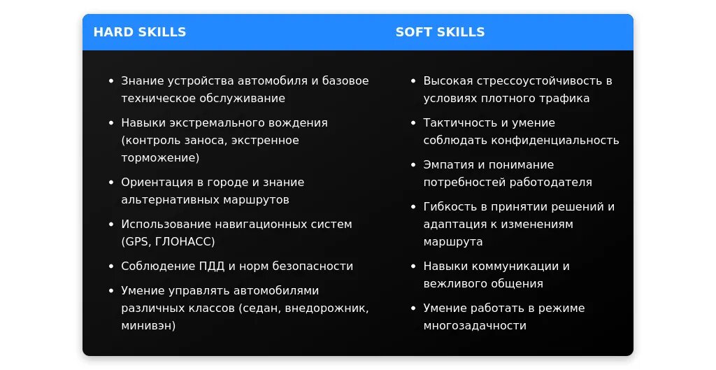 ✅ Пример 2: "Знание ПДД, базовые навыки обслуживания автомобиля, готовность к профессиональному росту."