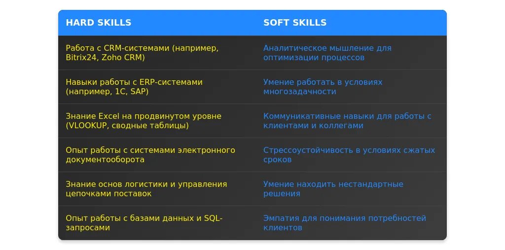 При анализе вакансии важно выделить ключевые требования, разделив их на обязательные и желательные. Обязательные требования обычно включают навыки работы с CRM-системами, знание офисных программ (Excel, Word), опыт работы с заказами и базами данных. Желательные требования могут включать знание английского языка, опыт работы с 1С или другими учетными системами, а также навыки многозадачности и стрессоустойчивости. Обращайте внимание на формулировки: если работодатель указывает "обязательно" или "желательно", это поможет расставить приоритеты.