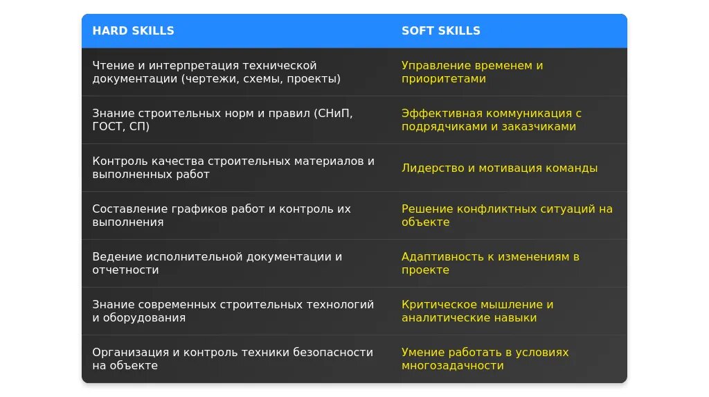 После адаптации: "AutoCAD, знание СНиП и ГОСТ, управление строительными бригадами, контроль качества."