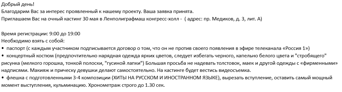 Что еще хочется сказать: Почему-то именно о Питерском кастинге в СМИ и источниках почти нет информации. Слишком закрытые результаты, слишком быстрые прослушивания. Людей, которым на предкастинге отказывали - очень много. Очень хочется верить в честный кастинг. ОЧЕНЬ хочется!