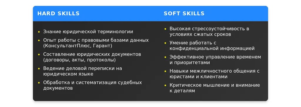 В разделе "Навыки" перегруппируйте компетенции, чтобы выделить ключевые для вакансии. Укажите навыки работы с юридическим ПО, знание терминологии и организационные навыки.