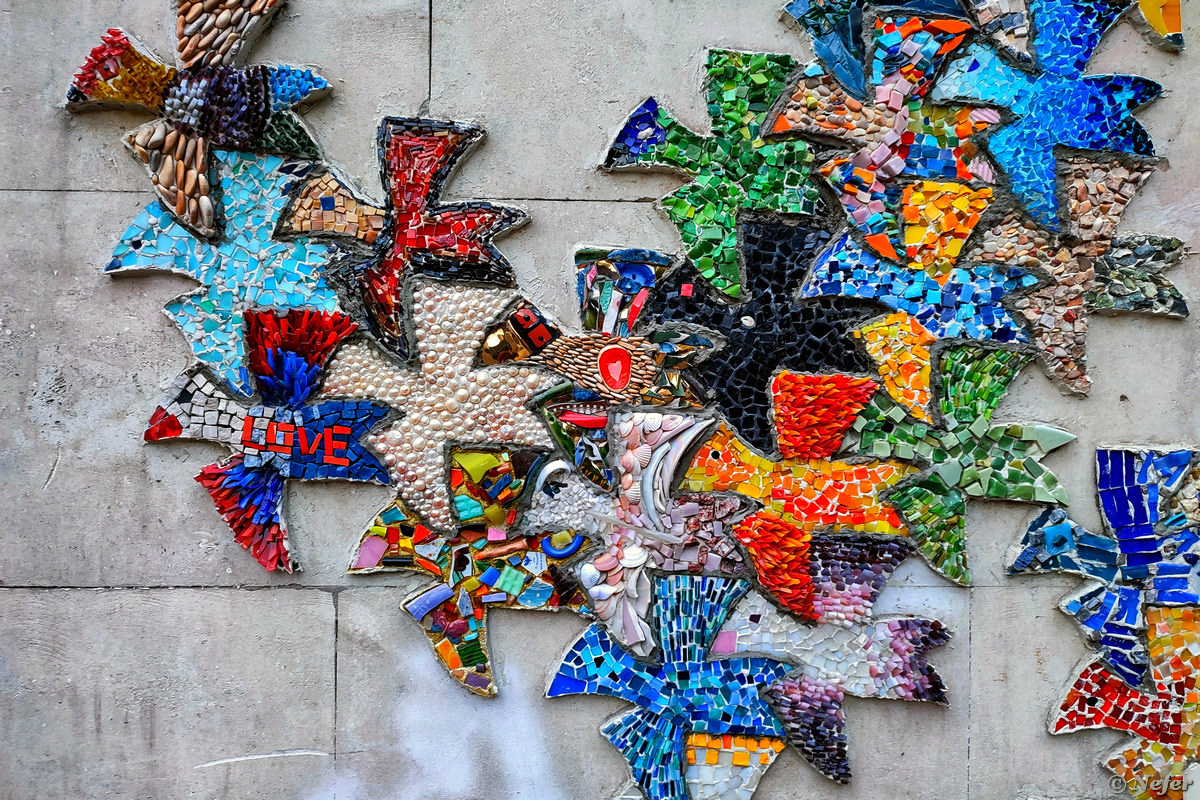 Там же, в ЦТИ "Фабрика". Ходили-ходили, увидели указатель "Школа мозаики Фавока". Был вечер, после 20 часов все уже закрывается, а эта мастерская еще работала. Иногда по выходным они проводят бесплатные мастер-классы, люди делают вот таких птиц. "Фавока" занимает помещение 1-21. Входить лучше через проходную № 2. Но вечером она уже закрыта, и нам пришлось обходить здание вокруг. На первом этаже висят примеры работ и большое панно с рыбами, еще не доделанное. Пока поднимаешься по лестнице, натыкаешься на такое вот, черкаши на стенах кто-то превратил в крестики-нолики. А потом... Какой-то другой мир, яркий и уютный. Люди сидят и выкладывают из кусочков картины. В основном это римская мозаика, но есть и работы из стекла, обучают витражной технике, а под потолком висят мозаичные портреты известных персонажей. Особенно круто, когда используется старая посуда и керамические осколки, которые обретают новую жизнь и становятся частью ярких образов. Мне понравилось, я могла бы иметь такое хобби.