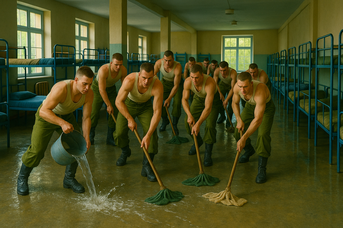 Да, ну я отвлекся- старшины и прапорщики постоянно следят за чистотой и порядком в армии и как правило раз в месяц, обычно в субботу вся рота, а это около 100 человек начинает большую помывку «взлетки» ну и заодно всего остального. «Взлеткой» в казарме называют свободную от кроватей часть помещения роты. Это означает, что человек (если к солдатам применимо это слово) таскают из подсобки воду ведрами и щедро выливают ее на «взлетку» а остальные вооружившись тряпками старательно гонят эту воду от Ленинской комнаты -не знаю, как сейчас в армии называют эту комнату- и телевизора к туалетам. Гонят не спеша, вздрагивая от окриков старшины, который орлом нависая над взлеткой бдительно контролирует ход уборки и постоянно приказывает притащить и вылить побольше воды и лучше тереть тряпками деревянный пол помещения роты. Зачем все это делается? Все очень просто- все старшие и не очень офицеры прекрасно знают одну простую истину- "Праздность солдата ведет к преступлению"