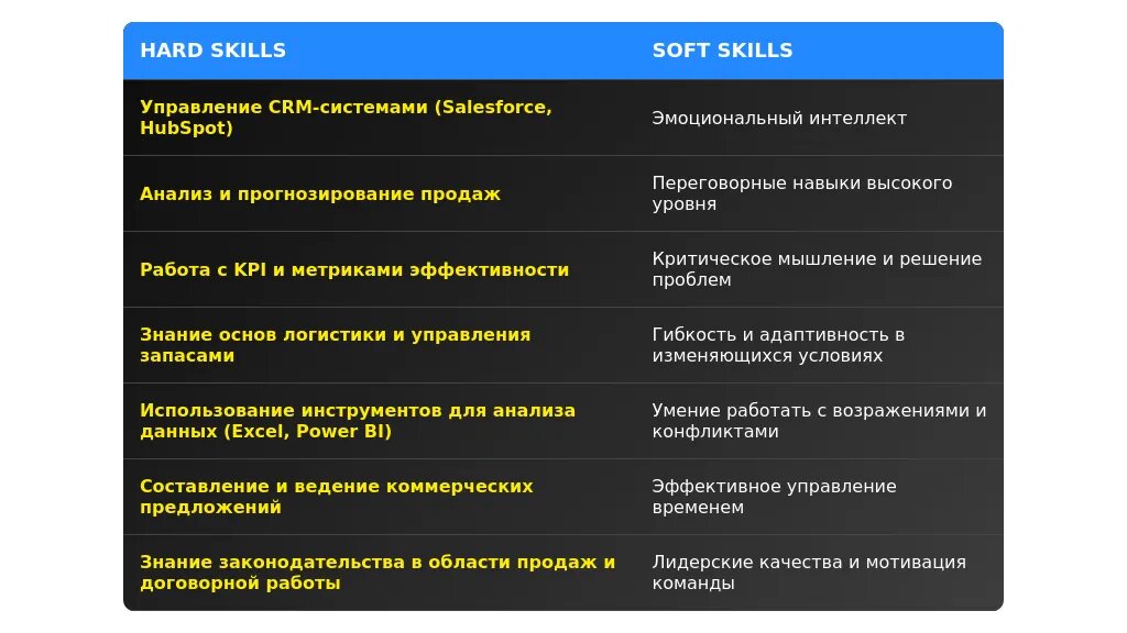 После адаптации: "Навыки ведения переговоров, работа с крупными клиентами, знание CRM-систем (Salesforce, Битрикс24)."