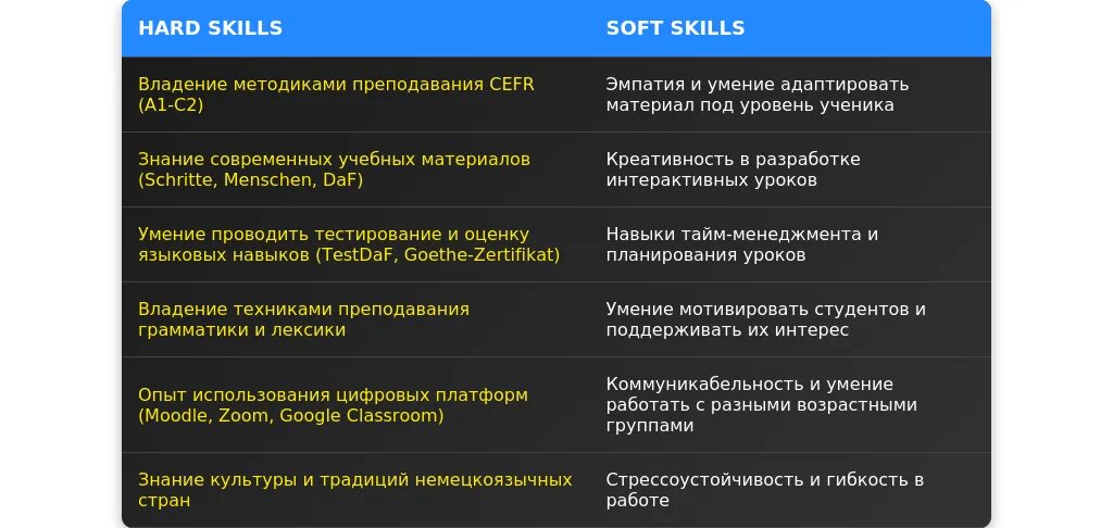 До адаптации: "Знание немецкого языка, опыт преподавания."