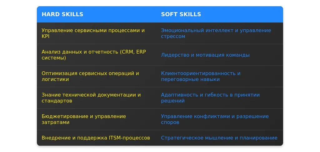 - "Творческий подход" – не релевантно для руководителя сервисной службы.