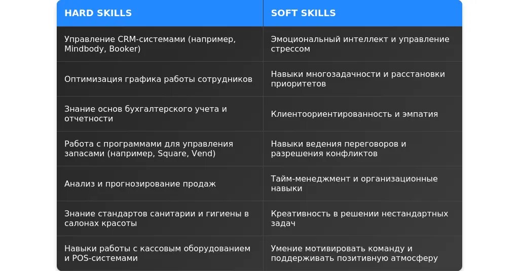 После адаптации: "Навыки работы с CRM-системами (Yclients, Mindbox), опыт управления командой, знание кассового оборудования."