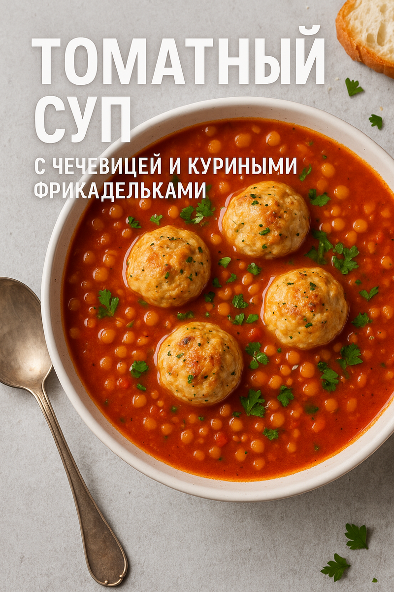 Томатный суп с чечевицей и куриными фрикадельками — это не только вкусное и сытное блюдо, но и настоящее спасение для тех, кто хочет питаться правильно, не жертвуя насыщенностью и ароматом. Это блюдо идеально впишется как в обеденное, так и в ужинное меню, согреет в прохладную погоду и зарядит энергией благодаря богатому составу. В основе рецепта — простые и доступные продукты: чечевица, куриный фарш, овощи и томаты. Чечевица богата растительным белком и клетчаткой, а куриные фрикадельки делают суп особенно сытным и питательным. При этом он остаётся лёгким и диетическим — то, что нужно для сбалансированного питания. Для супа: Для фрикаделек: Очистите и мелко нарежьте лук, морковь и сельдерей. Чеснок измельчите. Эти овощи станут ароматной основой для супа. В кастрюле с толстым дном разогрейте оливковое масло. Обжарьте лук до прозрачности (около 3–4 минут), затем добавьте морковь, сельдерей и чеснок. Жарьте ещё 3–4 минуты, помешивая. Добавьте в овощи томатную пасту. Перемешайте и о