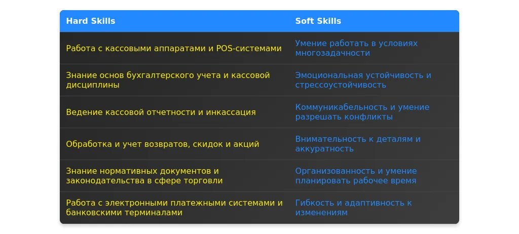 - Достижения: Напишите о своих профессиональных достижениях, например, "Повышение точности кассовых операций на 20%".