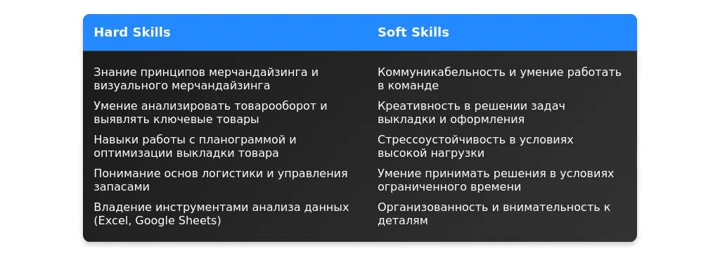 - Способен быстро адаптироваться к изменениям в стандартах выкладки