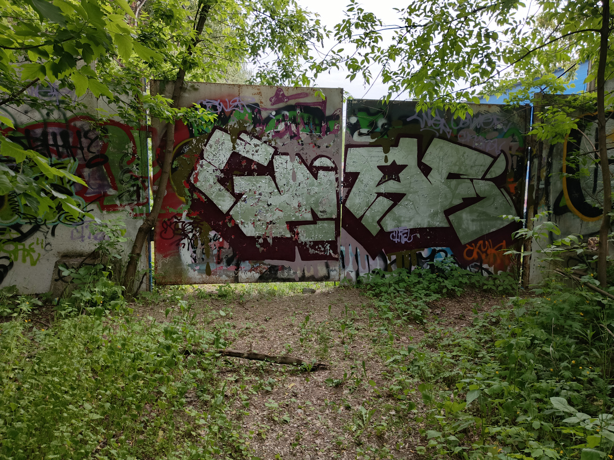 Кузьминский парк, пустырь в районе пейнтбольной базы «Полигон», много граффити