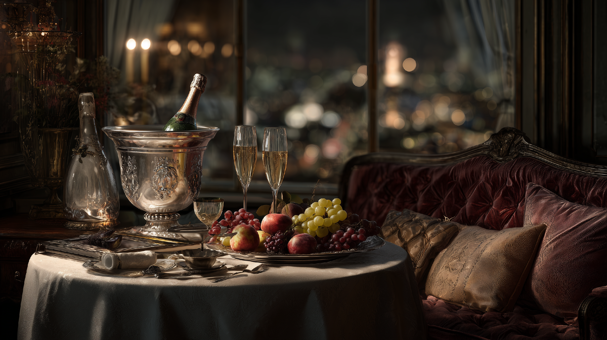 Круглый стол, островок безупречной белизны льняной скатерти в сумраке комнаты, торжественно предстал у самого окна, приготовленный для некоего священнодействия. Сервировка блистала отполированным серебром приборов и хрусталем бокалов, отражая слабый свет, проникавший сквозь вечернюю дымку за окном, – сцена, замершая в ожидании главных героев. Фрукты, разложенные на блюде с демонстративным изобилием, – каждый плод словно выписанный кистью старого мастера натюрморта. Шампанское, погруженное по горлышко в серебристое ведро, ощетинившимся пиками льда, заняло свое место в этом театральном представлении, предвещая неспешное, тянущееся сквозь века течение вечера.