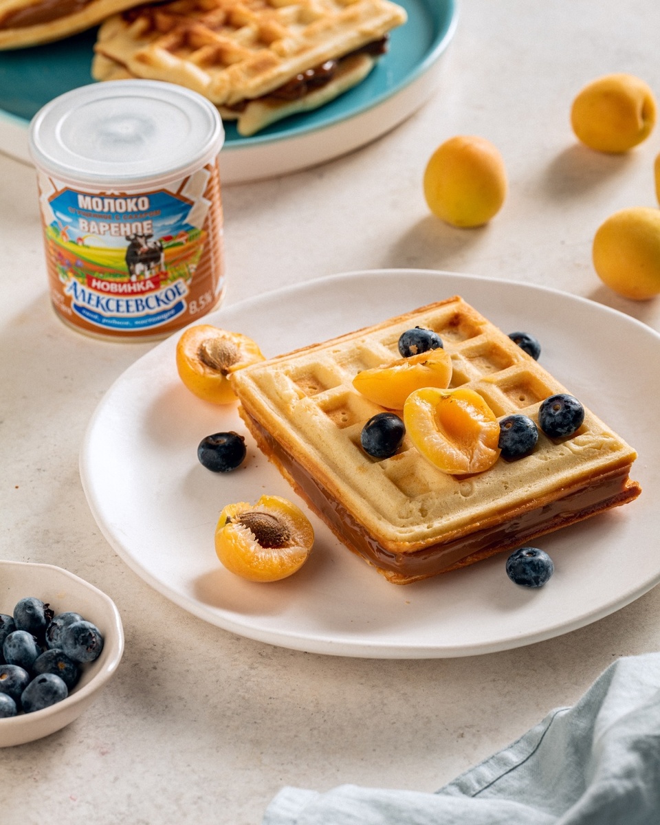 Ароматные вафли и вареное сгущенное молоко «Алексеевское» – идеальное сочетание для отличного начала дня! Готовить вафли просто. Весь секрет в правильной подаче: мягкое, карамельно-сливочное лакомство для начинки + свежие ягоды и фрукты для украшения. Для вафель вам понадобятся: Мука — 200 г