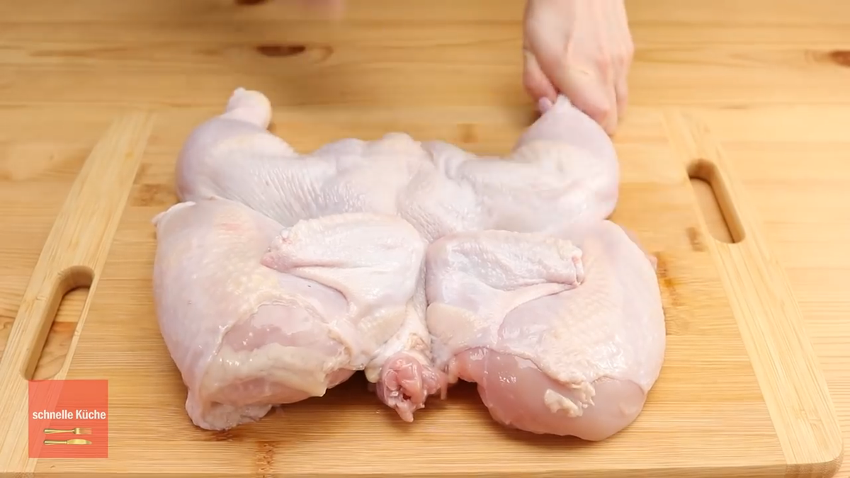 Разрежьте курицу со стороны грудки.