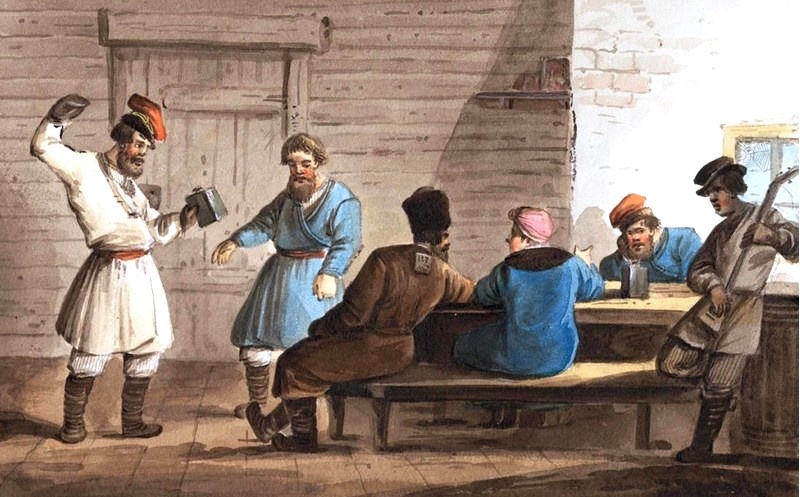 В Московии все было совсем иначе. На северо-востоке Руси общественная жизнь развита была слабо и русский вариант украинской корчмы — кабак, отличался контингентом и правилами поведения. В кабак не разрешалось приходить женщинам, подросткам и священникам, а ночлег, как правило, не предоставляли. Там ели и пили, иногда танцевали под нехитрые народные инструменты.