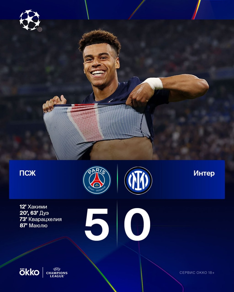 «ПСЖ» просто уничтожил «Интер» в финале ЛЧ! 👊🏻 Дуэ на спокойном оформил 2+1 в Мюнхене, а Хакими, Хвича и Маюлю забили еще по разу. Действительно исторический вечер для парижан! 🇫🇷