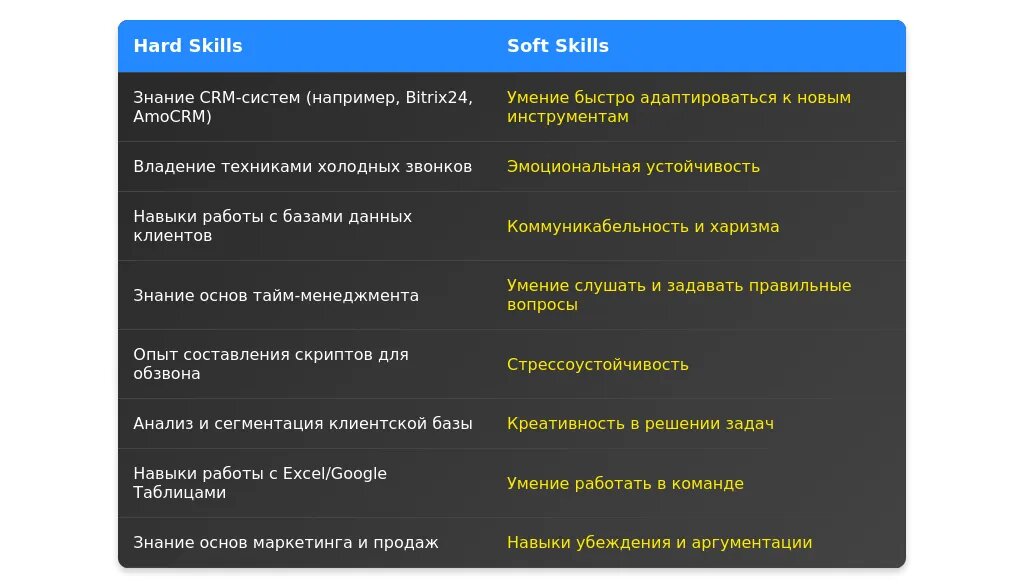 Навыки должны быть сгруппированы в соответствии с требованиями вакансии. Укажите ключевые компетенции, такие как работа с CRM, навыки обзвона, ведение переговоров и достижение KPI.