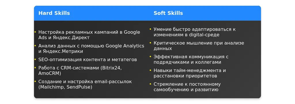 - Специализация в контекстной рекламе, контент-маркетинге, аналитике.