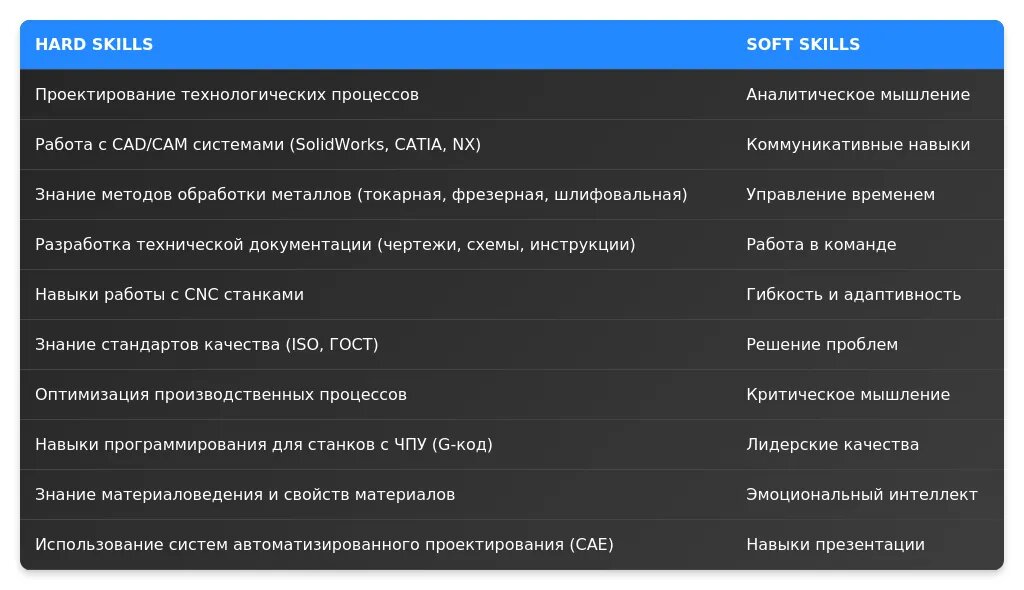 После адаптации: "Опыт работы с CAD-системами (SolidWorks, AutoCAD), знание технологий обработки металлов, английский язык (Intermediate)."