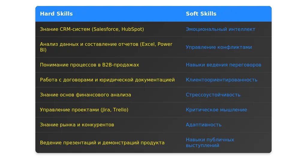 - Ведение переговоров на уровне C-level – способность взаимодействовать с руководителями высшего звена и принимать стратегические решения.