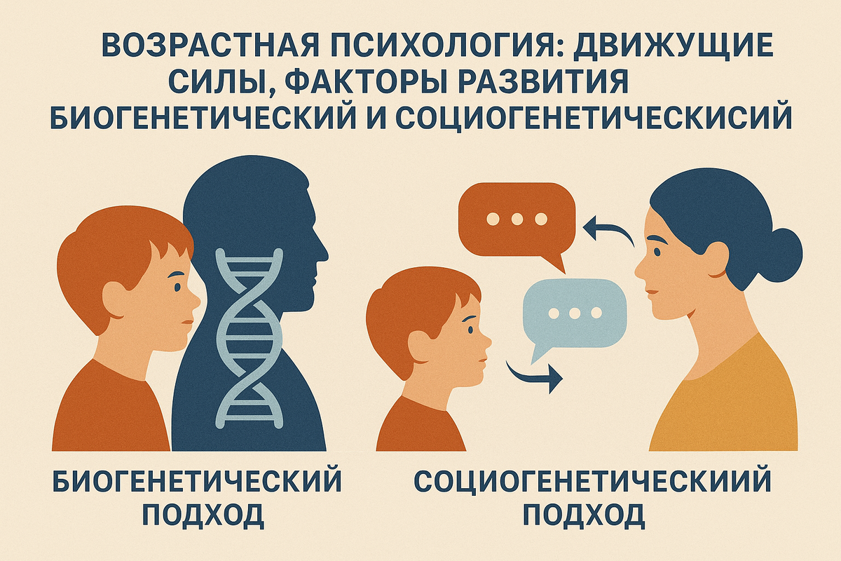 Возрастная психология оперирует широким понятием факторов и сил развития. Биогенетический подход акцентирует врожденные предпосылки, социогенетический — роль воспитания и культуры. Наиболее продуктивным сегодня считается интегративный подход, признающий развитие результатом взаимосвязи биологического и социального, при активной роли самого индивида.