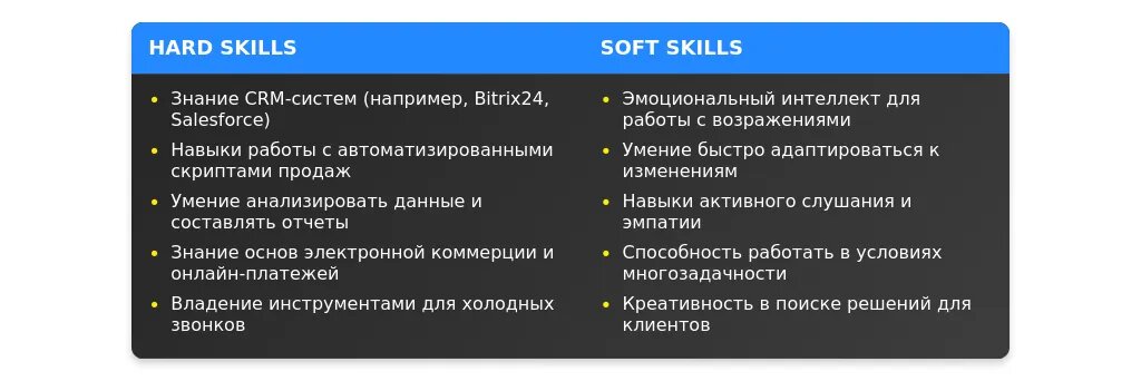После адаптации: "Знание английского языка (уровень Intermediate), работа с CRM-системами, аналитика продаж."